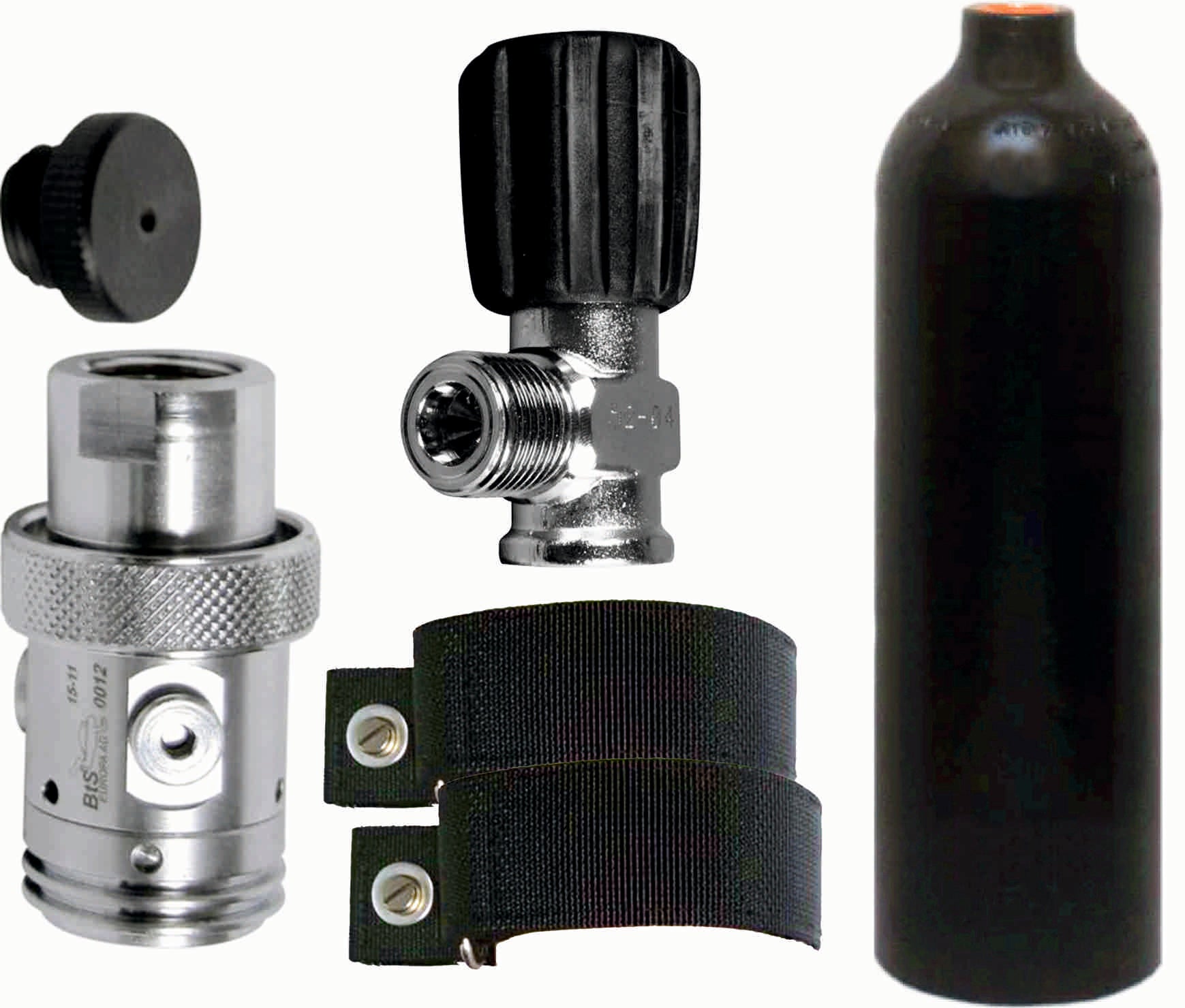 BTS 0.85 Litre 230 Bar Black Luxfer Aluminium Cylinder with W21.8 Inert Gas Valve, 1st Stage, OPV & Backplate Mounting Straps S20999905