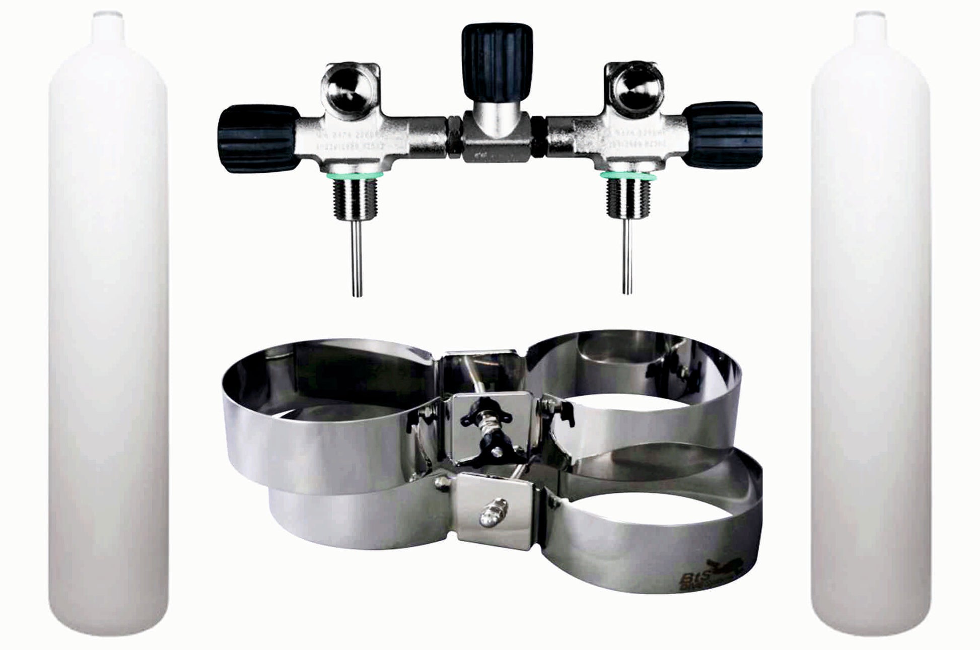 BTS 8.5 Litre 232 Bar DIN Flat Bottom Steel Cylinder Twin Set with Isolation Manifold & Bands S16116606