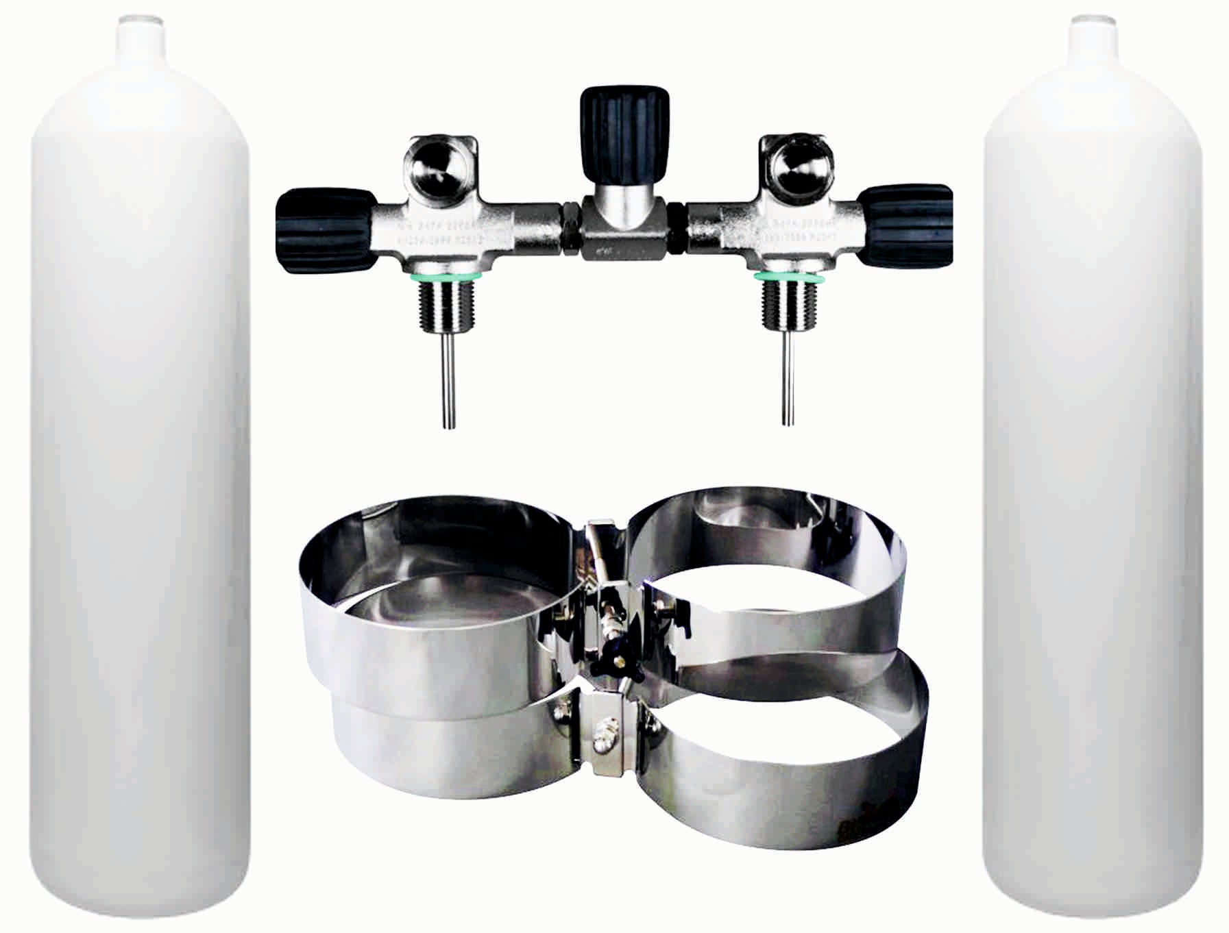 BTS White Flat Bottom 12 Litre 232 Bar DIN Steel Cylinder Twin Set with Isolation Manifold & Bands S16816692